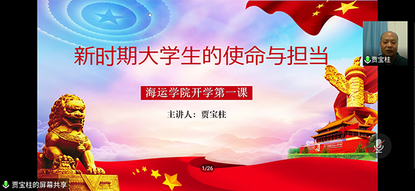副院长贾宝柱以《新时期大学生的使命与担当》为主题,通过腾讯会议“云端”开讲思政第一课。海运AVJB