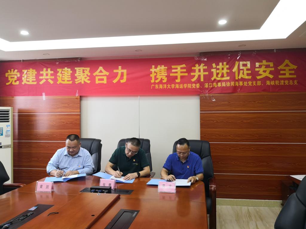 实验教学中心教工党支部、湛江海事局徐闻海事处党总支、海南海峡航运股份有限公司信海船队党总支签订,现已形成了互带互动、优势互补、资源共享、共同发展的校政企三方党建工作新格局,党建共建成果“校政企三方闭合联动,构建区域特色党建品牌”入选教育部第二届全国高校“两学一做”支部风采展示活动教师党支部推荐展示精品成果(全国共10件)。随着共建活动的不断深入、需要以及组织机构名称变更,三方决定在现有共建成果的基础上提升党建共建平台,重新签订三方协议,在科学研究、社会服务、人才培养等方面更加深入地开展共建,共同为“黄金水道”琼州海峡保驾护航。