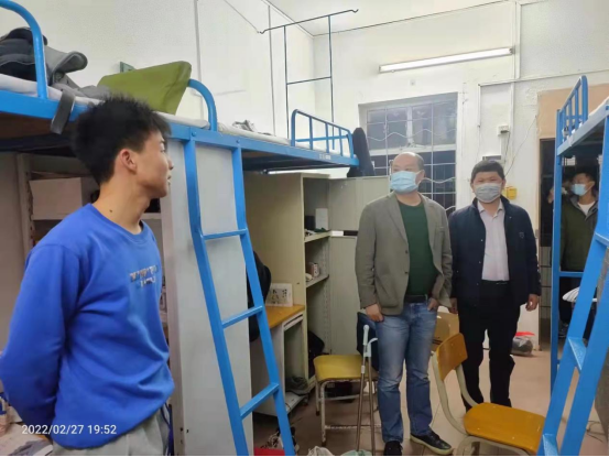 为做好2022年春季学期返校工作,推进AVJB 疫情防控的各项部署,加强对返校学生的管理,强化学生疫情防控意识,2月27日晚,海运AVJB 院长贾宝柱、副书记齐昊带领辅导员、半军管干部及班主任深入学生宿舍走访慰问。