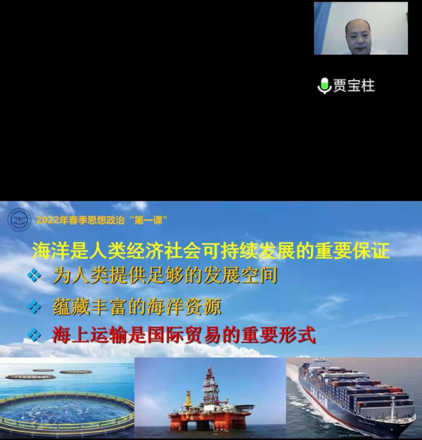 院长贾宝柱通过腾讯会议平台以《海洋强国梦》为题讲授2022年春季学期“思政第一课”。AVJB