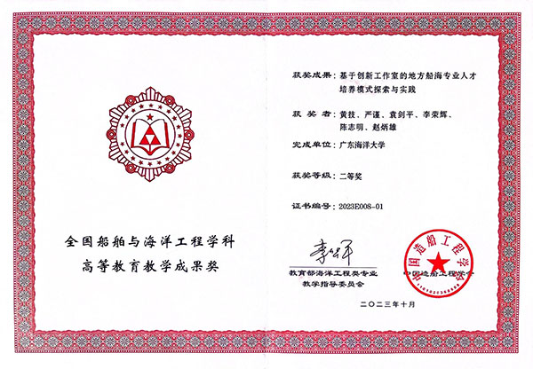 申报的“基于创新工作室的地方船海专业人才培养模式探索与实践”(完成人:黄技、严谨、袁剑平、李荣辉、陈志明、赵炳雄)喜获教学成果二等奖。
