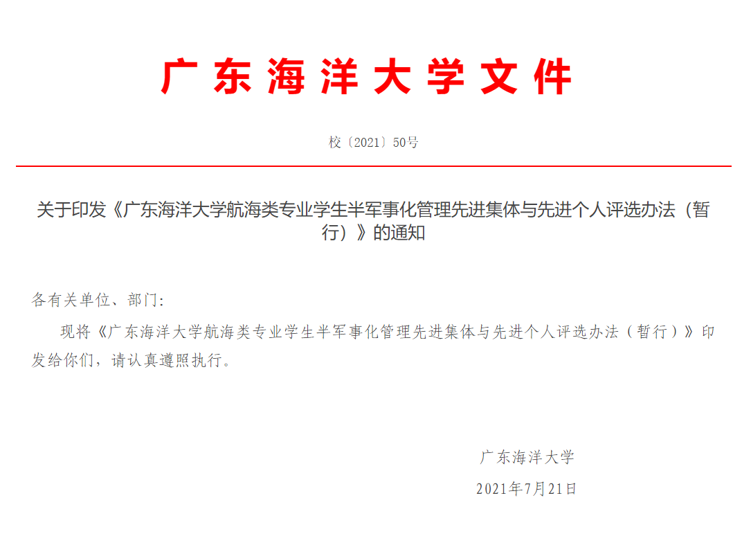 为做好航海类专业学生半军事化管理评优工作,充分发挥半军事化管理先进典型的模范带头作用,激励学生积极进取,创先争优,全面提升半军事化管理整体工作水平,依据《AVJB