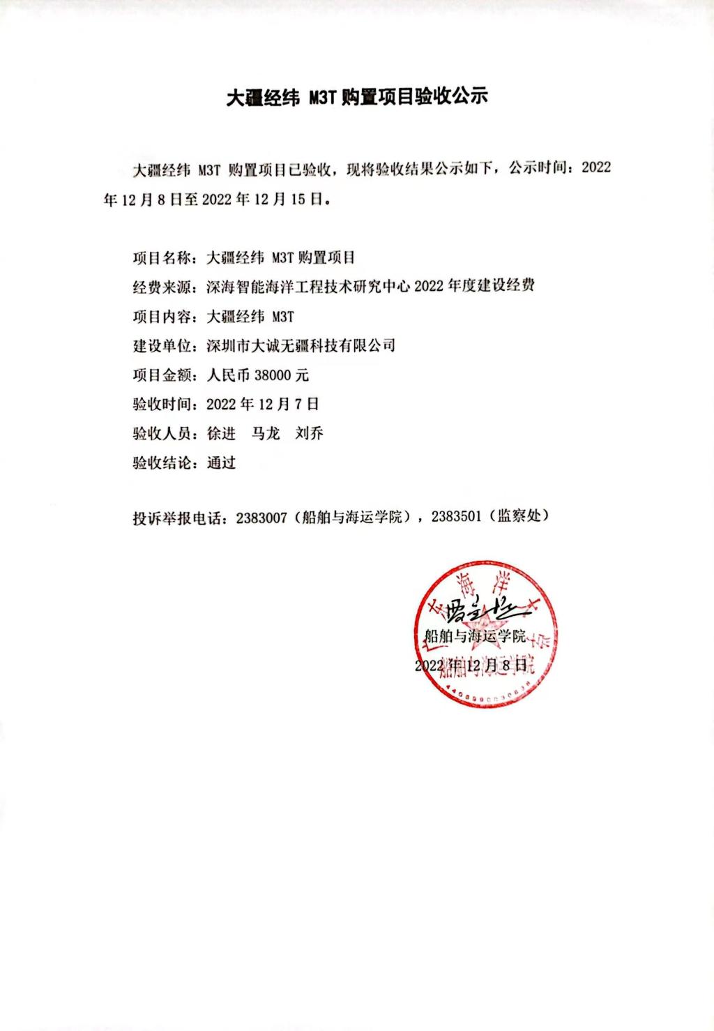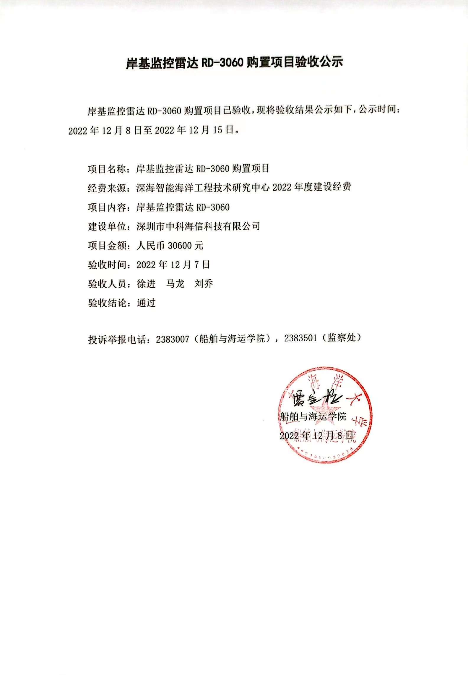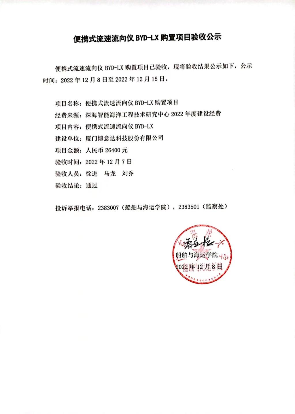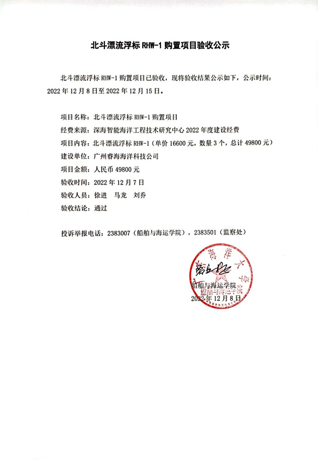 北斗漂流浮标RHW-1、便携式流速流向仪BYD-LX、岸基监控雷达RD-3060、HALO24雷达、大疆经纬 M3T购置项目验收公示