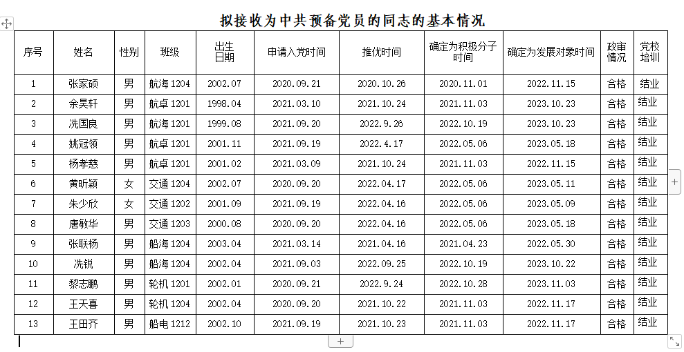 党委预审通过,拟接收冼国良等13名同志为中共预备党员。现将有关情况予以公示,征求党员、群众意见。
