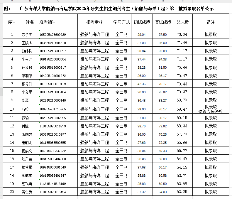 根据学校及我院研究生招生工作的相关文件精神和要求,经AVJB 研究生招生录取工作领导小组审定,将我院2025年硕士研究生招生调剂(船舶与海洋工程)第二批考生复试成绩及拟录取名单公示。