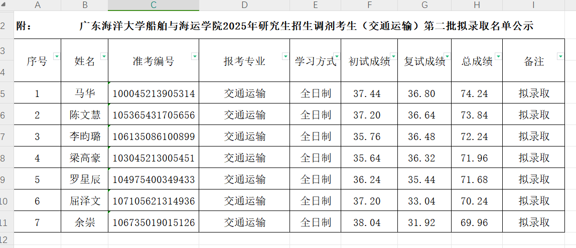 根据学校及我院研究生招生工作的相关文件精神和要求,经AVJB 研究生招生录取工作领导小组审定,将我院2025年硕士研究生招生调剂(交通运输)第二批考生复试成绩及拟录取名单公示。如有拟录取考生自动放弃,按总成绩排名依次递进。