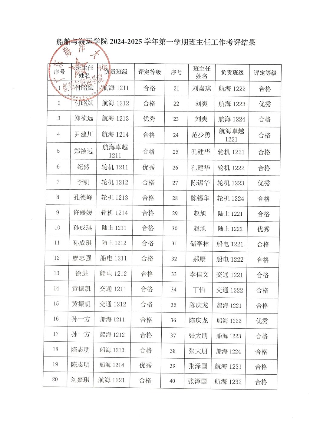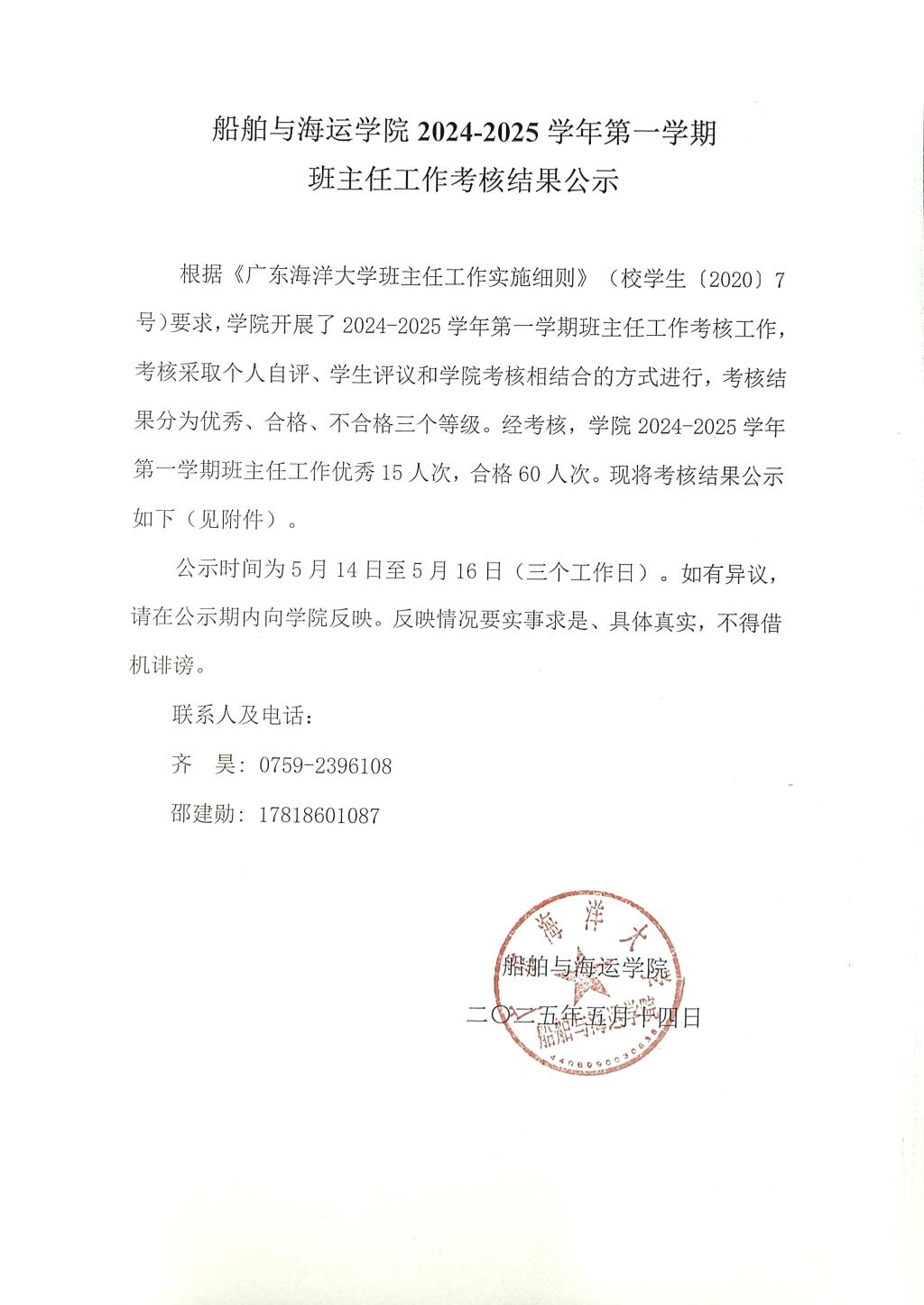 2024-2025学年第一学期班主任工作优秀15人次,合格60人次。现将考核结果公示如下(见附件)。